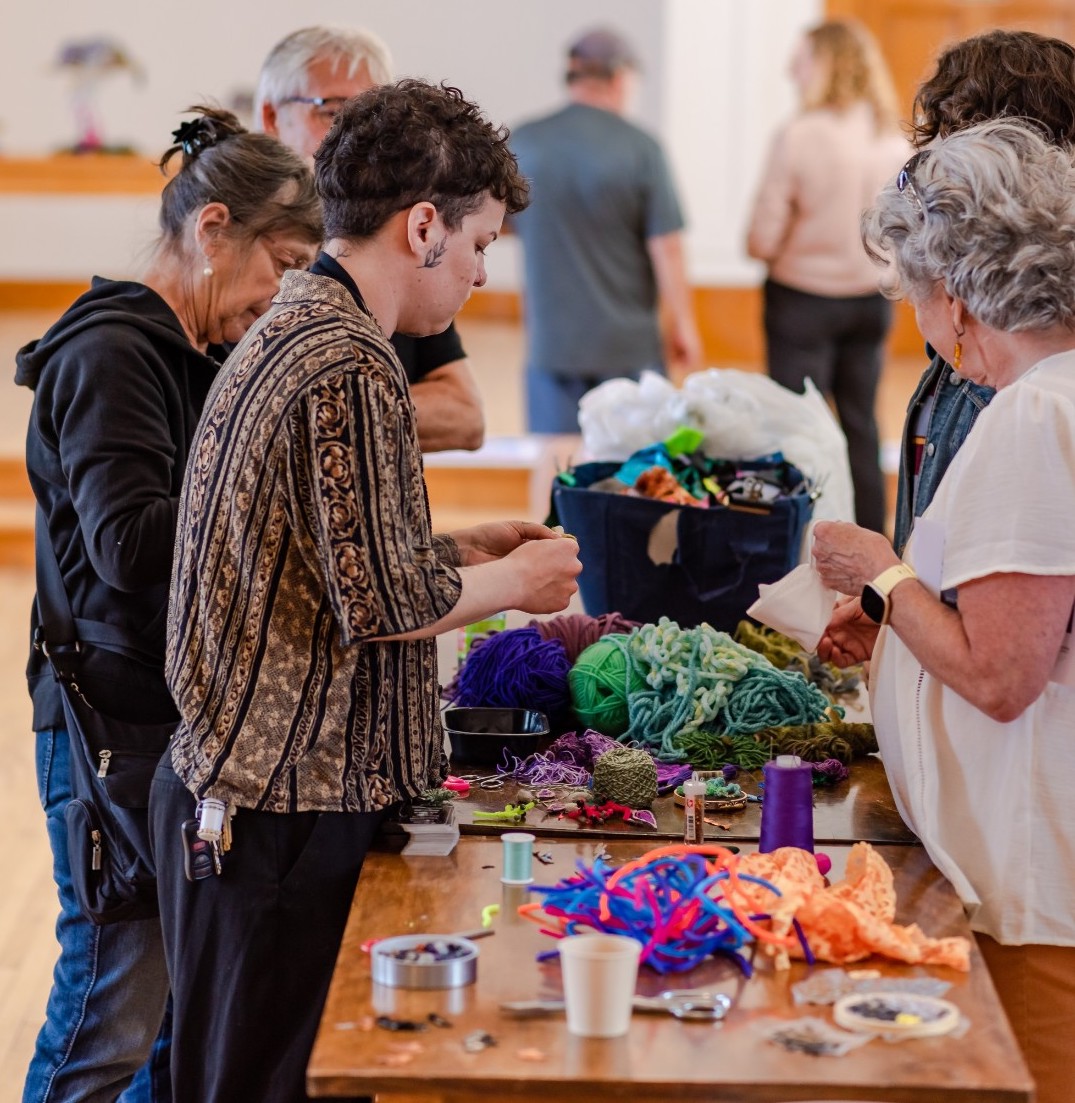 Activité de médiation culturelle en sortie de résidence à Vrille art actuel où le public était invité à créer de la végétation en textiles afin d’agrémenter les montagnes | Crédit photo : Audrey Mainguy