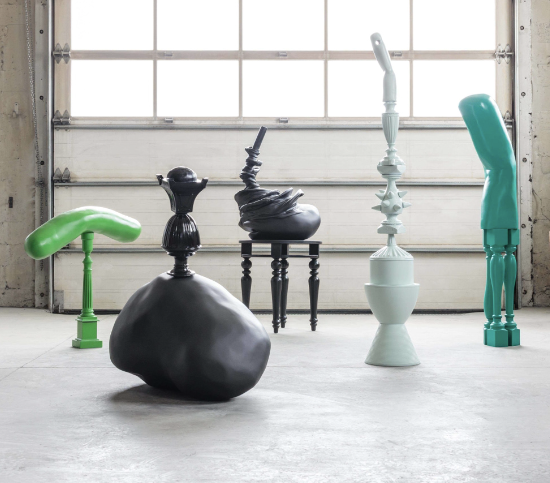 De gauche à droite : Éloge du doute (résine, cuivre, bois, peinture – 86 x 94 x 20 cm), Libre et oblique (résine, cuivre, bois, peinture – 100 x 93 x 70 cm), Introspection (résine, bois, peinture – 150 X 62 X 62 cm), Poésie verticale (céramique, résine, bois, acier, peinture – 180 x 30 x 30 cm), L’inconnu (résine, bois, peinture – 156 x 41 x 25 cm)