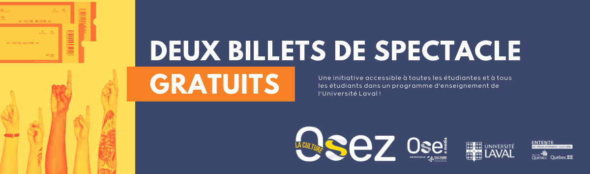Les étudiantes et étudiants participant peuvent se procurer jusqu'à deux billets de spectacle gratuits.